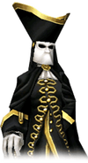 His outfit is like most other clockworks. A fancy uniform with buttons and a big hat. His face (mask) is a bit different from other clockworks, as it seems to wrap around the front of his head, instead of being a mask, and being a replacement for a face, like other clockworks. He also has a black cape, and carries a cane for seemingly no reason, (though he does have a gun.)