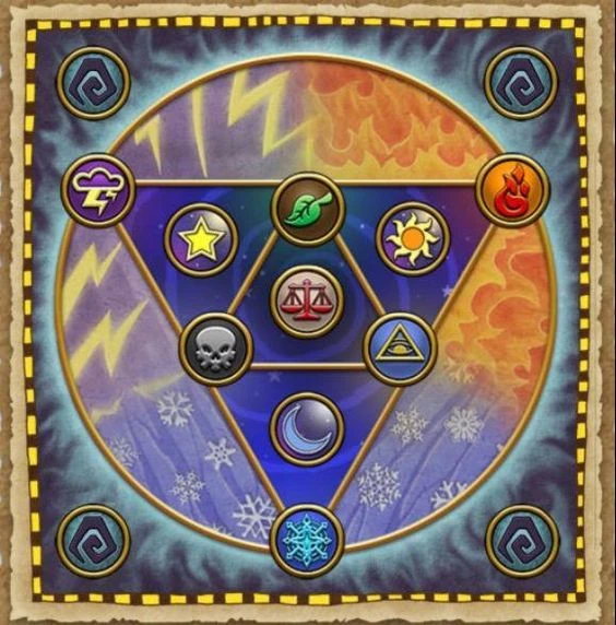The Triangle of Magic shows the relationships between all the Schools of Magic.